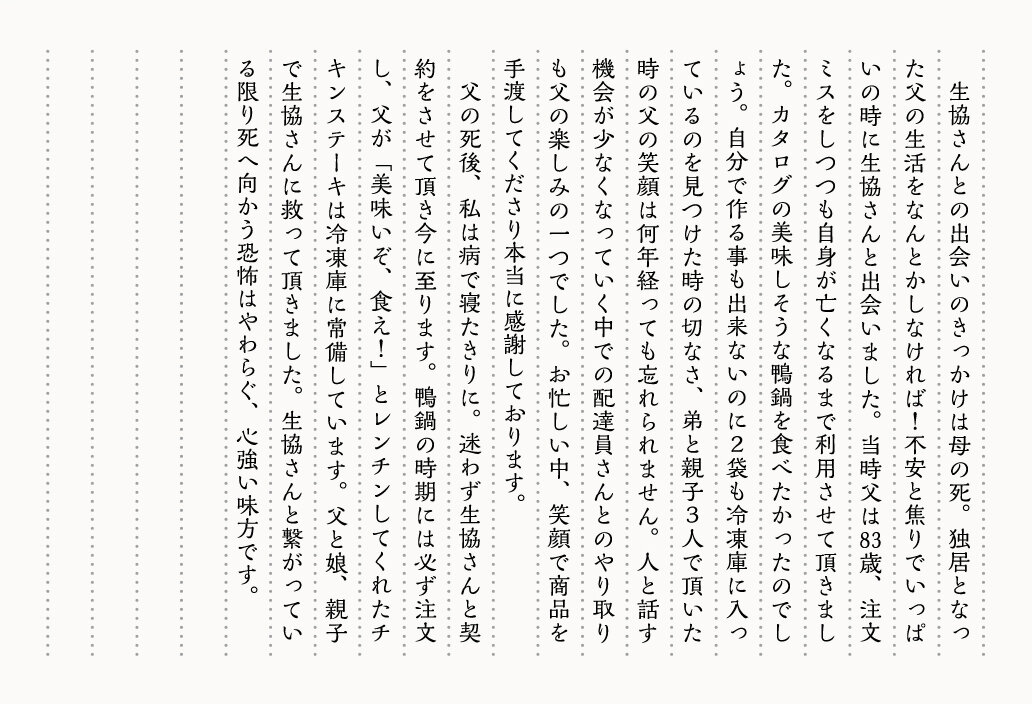 お母様が先立ち、独り暮らしとなったお父様と生協のお話。冷凍庫で見つけた鴨鍋。それを一緒に食べた時の嬉しそうなお父様。見つけた時はせつなさもあったが、食卓を囲むきっかけとなり忘れられない程の笑顔に繋がった。毎週配送担当者とのやりとりも楽しみにしていたお父様。くらしに笑顔が広がったお話に心が温まりました。