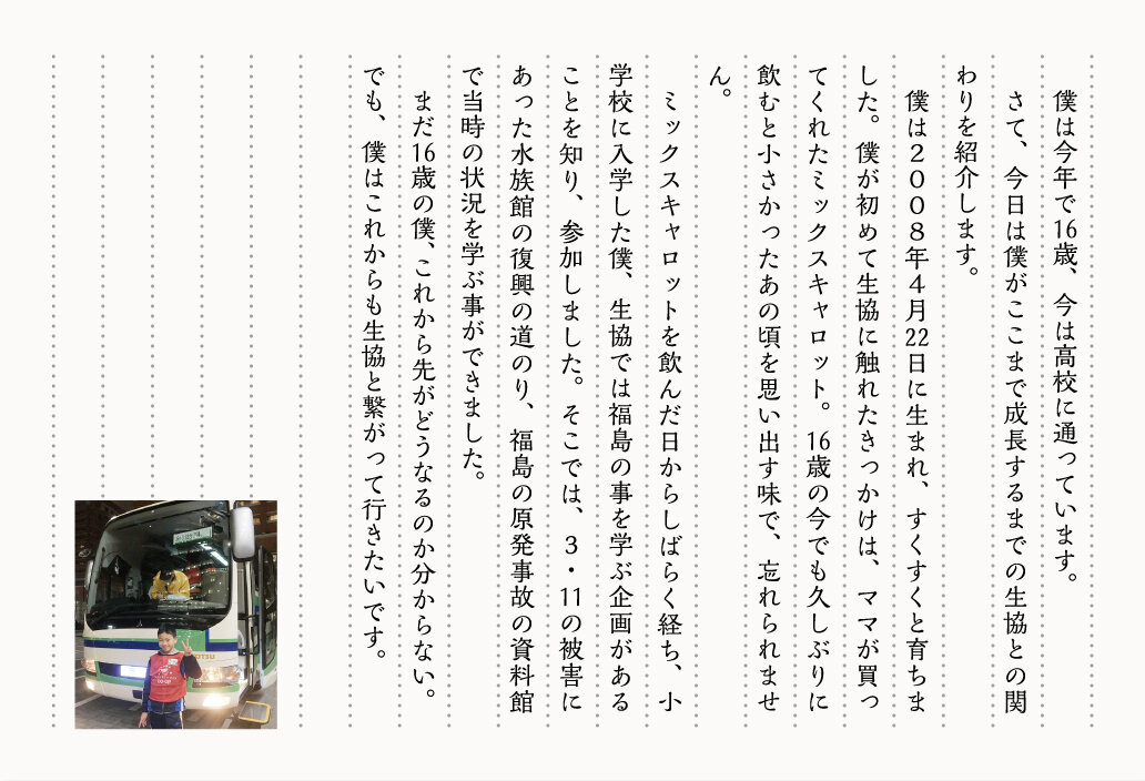 寄せられたエッセイの中で唯一男子高校生からのエッセイ。ミックスキャロットの思い出や小学生のとき福島のことを学ぶ企画に参加されたこと、自分の目で見て感じ多くの事を学ばれたことでしょう。行動力に感動しました。これからも生協と関わりながら、人とつながる力を大切にして成長されることを楽しみにしています。
