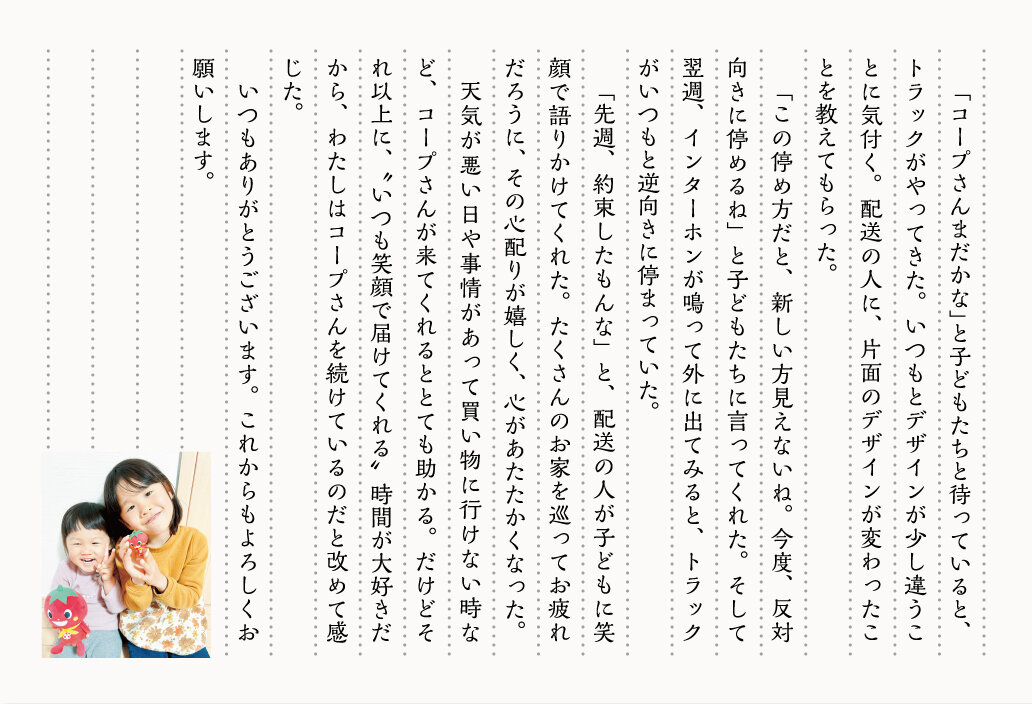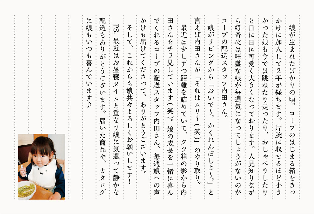 お子さんの誕生をきっかけに始まった生協とのつながり。毎週の配送で商品とともに娘さんへの声かけも届く、そんな配送担当者と娘さんの心和むやり取りの一場面が紹介されています。配送担当者との間に信頼と安心感が感じとれ、ほほえましい情景が目に浮かびます。