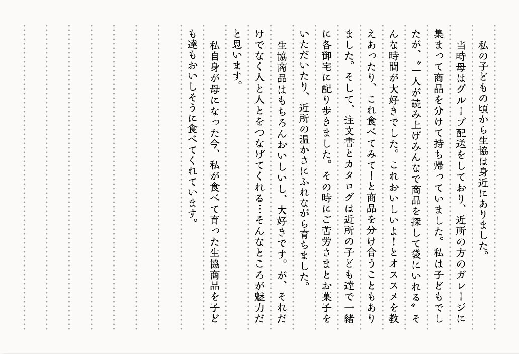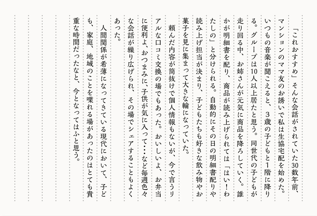 子どもの頃から生協が身近なものでご近所の温かさに包まれていたことが、班配送で集まった方々との楽しそうなやりとりや商品を分けあう様子から当時の風景が浮かび、あたたかい気持ちになりました。母となり子どもへと受け継がれている生協商品への愛だけでなく、人とのつながりの大切さが伝わってきました。