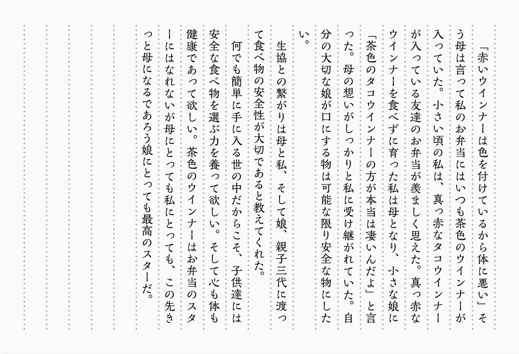 商品の学びや産地の方との交流など主婦をしているだけではできない経験を、長年組合員活動を通じ自身の宝物と表現されたエッセイ。人との出会いや交流が楽しくて仕方がない様子が伺えます。子育て終了後も一緒に楽しむ仲間や居場所がある大切さが伝わり、生協の良さがわかりやすく表現されています。