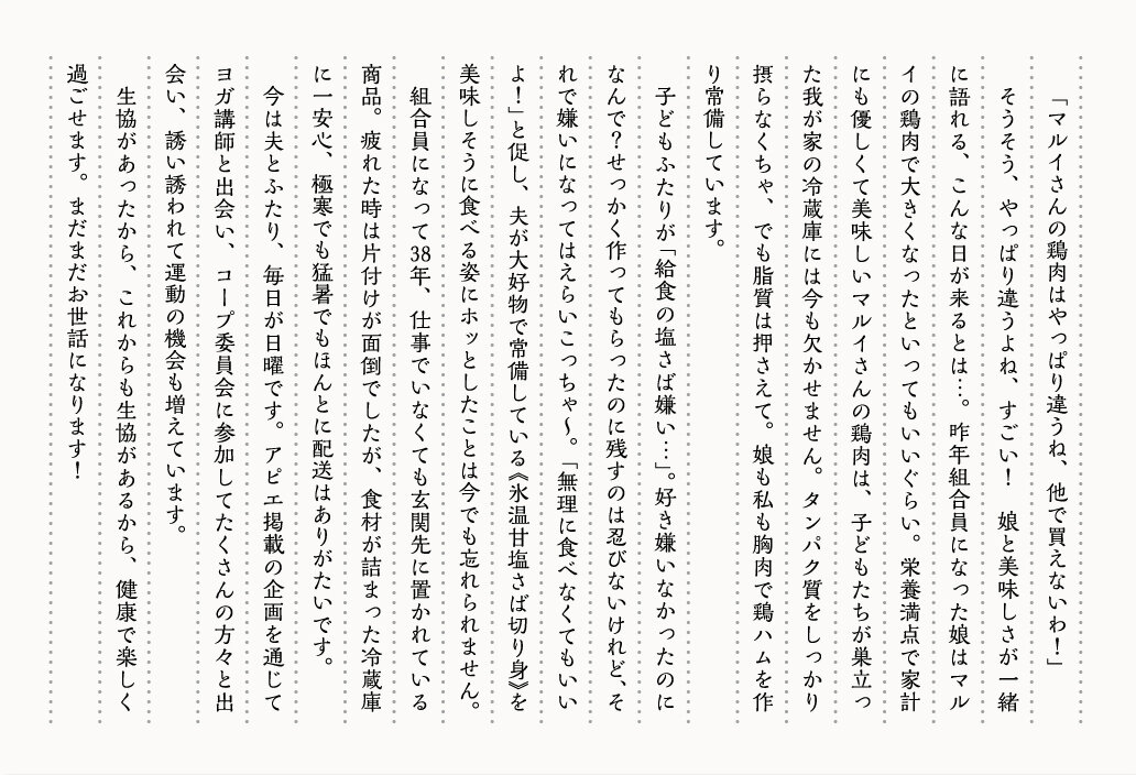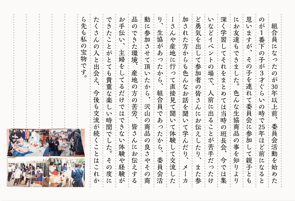 生協とのつきあいが始まって38年。子育て中もコープ商品に助けられ、巣立った娘さんも今では組合員に。コープ商品の良さを親子で語り合う様子が目に浮かびました。企画や委員会でたくさんの出会いがあり、生協があったから健康で楽しく過ごせる毎日。まだまだ生協と一緒に、その想いが詰まっていました。